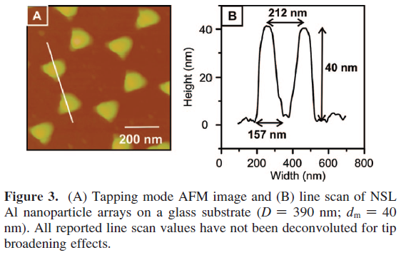 - **(A)**: Tapping-mode AFM 이미지 (Al 삼각형 나노입자 배열)