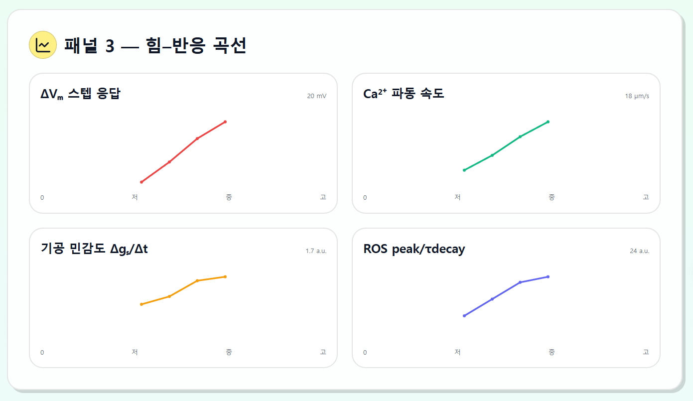 측정: 막전위·Ca²⁺ 형광(계단 자극) + 기공 개폐 속도(Δgₛ/Δt) 동시 기록.