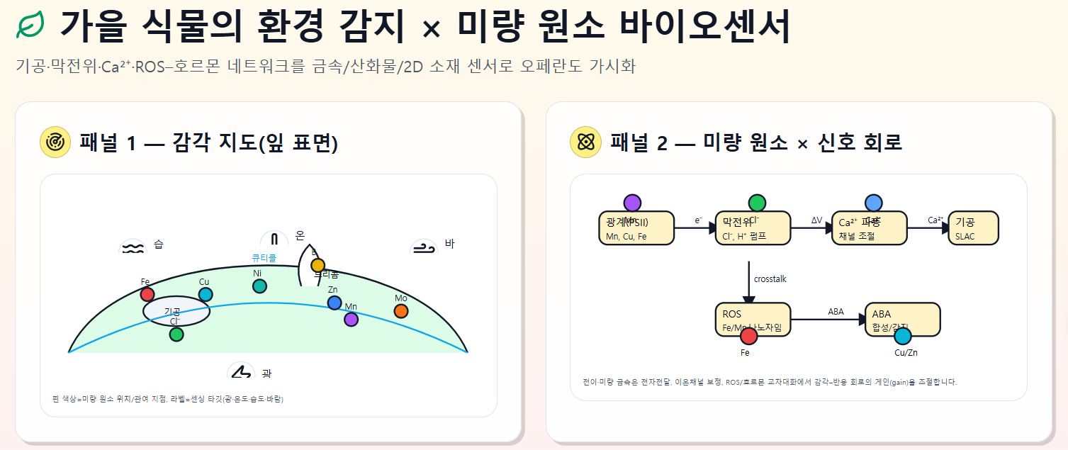 **미량 원소(Fe, Cu, Zn, Mn, B, Mo, Cl, Ni 등)**는 이러한 센서·신호전달에서 어떤 촉매/구조/전자전달(cofactor) 역할을 맡는가?