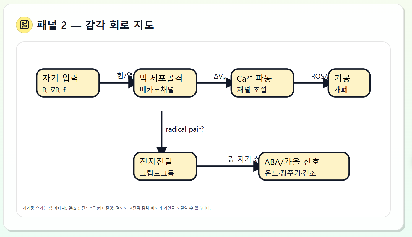 위 기본 축에 “자기장”을 겹치면, (i) 자유라디칼/전자전달 경로(예: 청색광-크립토크롬 라디칼쌍), (ii) 미세 기계력(자기 토크), (iii) 자성 나노입자에 의한 국소 가열·힘이 기존 감각 회로에 모듈레이션을 제공할 수 있다. *(상세한 자기수용 분자경로는 정설이 진행 중이지만, 위의 광·중력·기계·호르몬·전기 신호 축은 표준 생물학 교재의 합의적 내용입니다.)