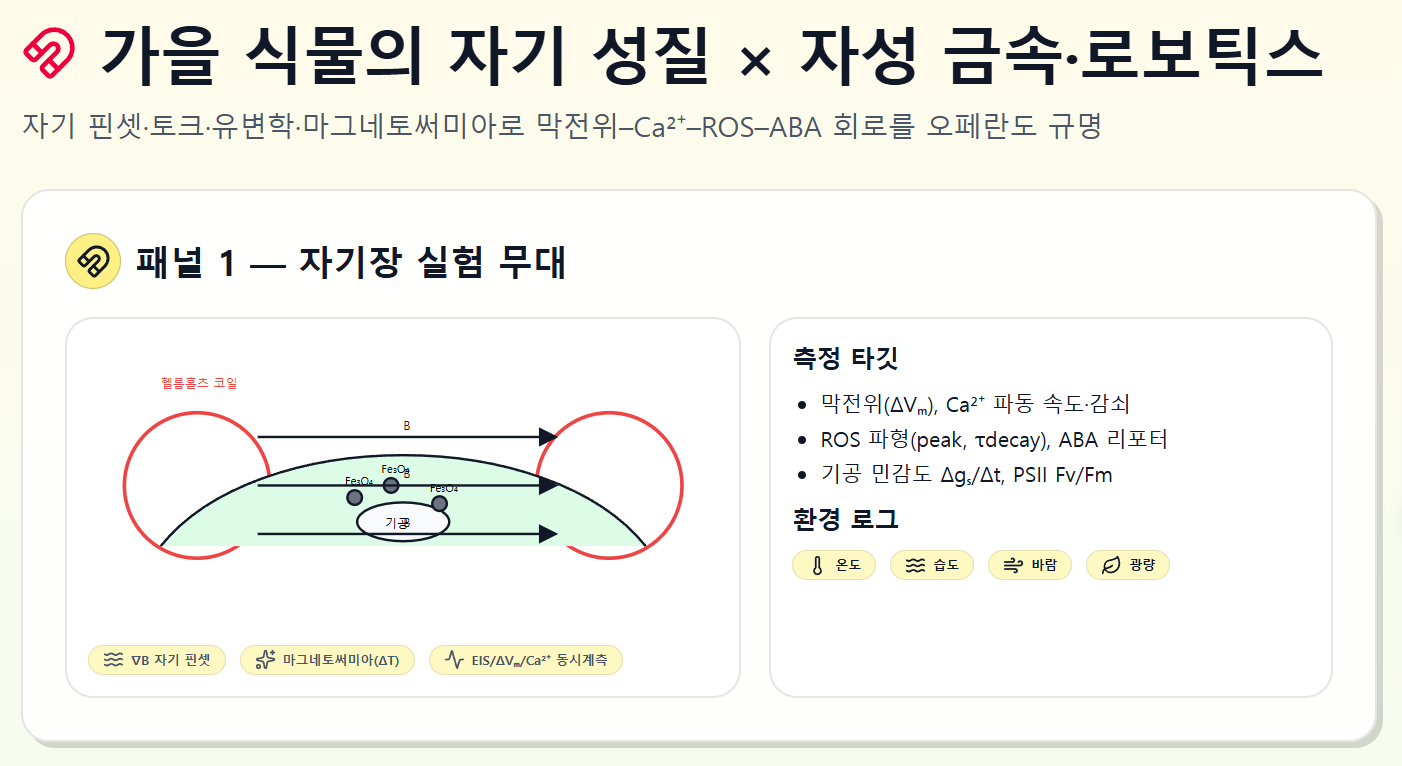 로봇 엔지니어링에서 쓰는 **자성 금속/산화물(Fe, Fe₃O₄, γ-Fe₂O₃, Co-, Ni-계)**과 **자기 조작성(자기 핀셋/자기 토크/자기유변학)**을 식물 연구에 어떻게 이식할 수 있는가?
