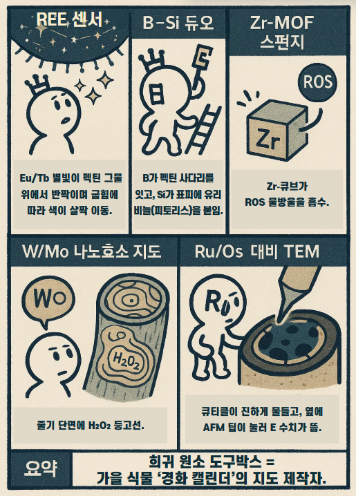 - ROS 플럭스 리포팅: Fe₃O₄(마그네타이트) 나노자임의 과산화효소 유사 활성으로 H₂O₂ 생성률을 현장 검출 → 전분 합성/분해 전환점 표시.
