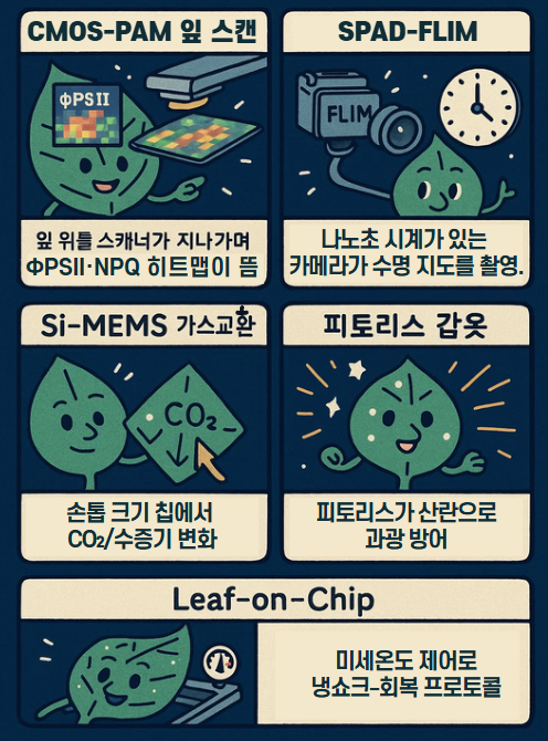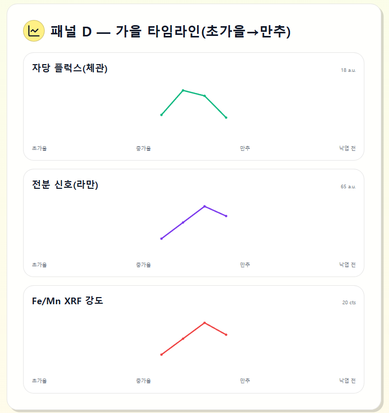 - 오페란도 라만/XRF(미세 X-선 형광): 잎맥/저장조직에서 Fe/Mn/Cu 분포와 전분 신호를 동시 취득 → TM 재분배 ↔ 저장 진행 상관분석.