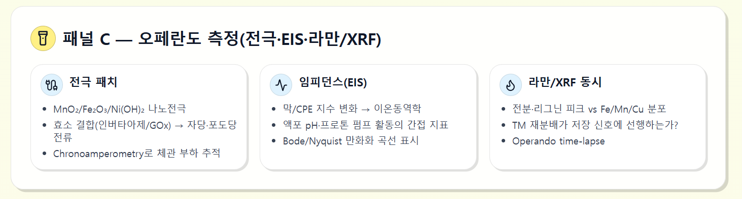 - EIS에서 막 임피던스↑ → 저장세포 이온 이동성↓; ROS 완충능(Fe-헤미 효소) 점검.